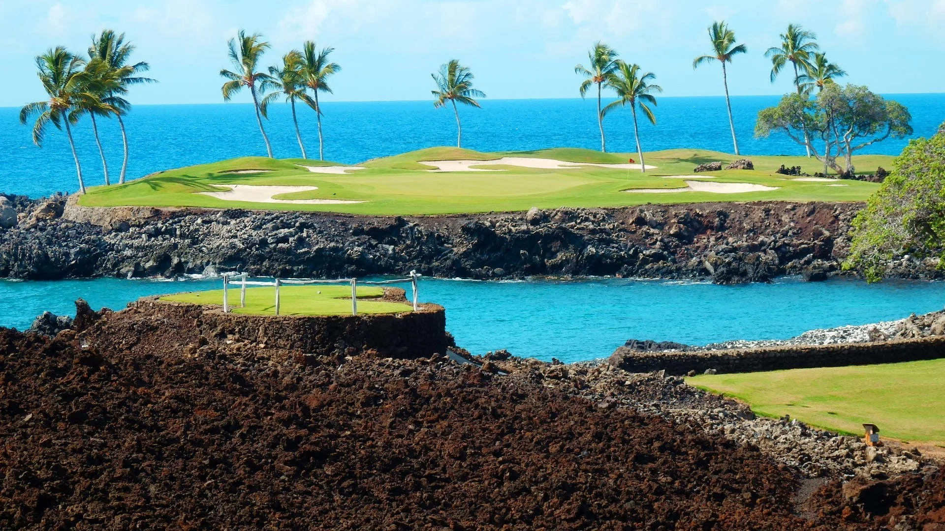 Built on ancient lava flows and framed by kiawe trees, each hole feels like a new world.